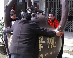 程苗根用了2吨湿泥原料,花了10个月才做完。当时,像造房子一样搭了脚手架,一点点做起来。好不容易做好之后,移位也是件非常麻烦的事,特地买了液压铲车,借了36立方米的大窑,可是紫砂壶却放不进去,后来只好把窑口给敲了,搬进去烧了二十多个小时。