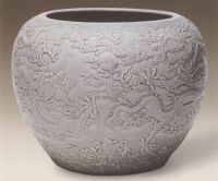 说 明: 此器采用"减地"的技法雕刻图案花纹,产生浅浮雕的效果,物象显得异常清晰生动,加之如此大器能够烧造得不变形,实属不易.