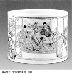 这是一件雍正粉彩“春夜宴桃李园”笔筒,现收藏在上海博物馆。笔筒通体彩绘着唐代著名诗人李白与众诗友“春夜宴桃李园”的故事。