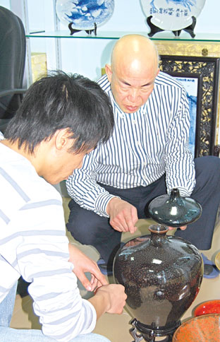 杨光远正在向收藏爱好者介绍“油滴黑天目”