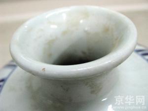 其次,宣德青花瓷胎体精密细腻,胎质洁白坚硬,薄厚适度,有油润感,这只梅瓶底部为无釉露胎砂底,以手摸之能明显感到极其细腻滑润,而新仿品的胎手感生硬;宣德青花瓷釉使用的是一种叫苏麻离青的进口青料,是当年郑和下西洋从波斯带回来的,这种料在明代成化年间基本就消失了,因此弥足珍贵,采用这种料烧出的瓷器釉面色泽深沉浓艳,有着自然晕散的艺术效果,料色熔融在釉中,好似深入胎骨一样,特别是浓色处出现铁锈般的银黑色结晶斑点,在一定光线下有锡光色,而且呈三角形结晶,用手抚摸釉面凹凸不平,用这种青料描绘的纹饰具有中国画的水墨韵味,被视为无法模仿的特色。