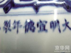 另外,器身肩下部横书“大明宣德年制”六字楷书款识,字体遒劲有力,属于典型的官窑器物,款识笔法工整清秀,用高倍放大镜照视,款识上部呈暗雾状而下沉,甚至晕散开来。