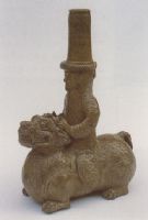 说 明: 造型奇异,通体施青黄色釉,采用印划方法装饰器身各部位的花纹,突出圆圈纹饰,这种器物的出现,说明当时的造型工艺及装饰艺术,都已具有较高水平.