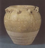 说 明: 南朝陈.釉色青中泛黄,釉开细纹片,挂釉处呈黄绿色玻璃状,晶莹明亮.胎质白色,虽有掺砂,仍较为细腻.造型规整,制作精细.