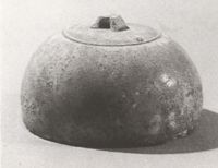 说 明: 南朝.胎质灰白,施青绿色釉,开冰裂细片纹,底露素胎.为古代衡器.