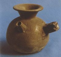 说 明: 胎质灰白,质地坚密.通体施青黄釉.此壶器型很小,与药碾等伴出,是一种温药用具.
