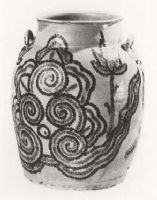 说 明: 胎呈米黄色,通体施黄釉,釉下绘褐,蓝彩.器形较大,纹样美丽.蓝彩系铜的呈色,在酸度较高的气氛中烧成.