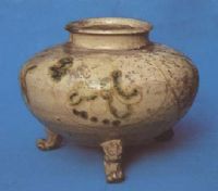 说 明: 胎骨灰白.通体施浅黄色釉.腹部分团的花卉图案,在邛窑产品中较为少见.学者称此类三彩器物为"四川唐三彩",亦有称作"邛三彩"者.