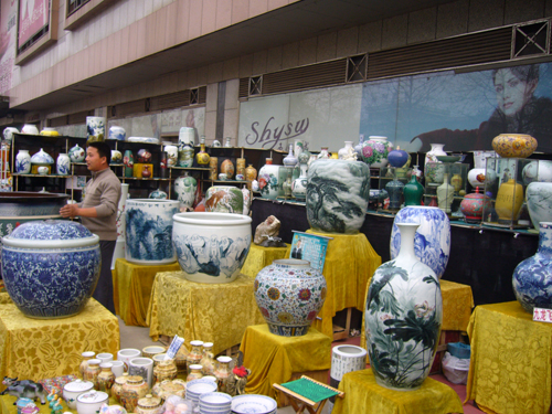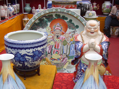 本次景德镇瓷器展从4月1日开始为期15天。记者昨日在展会上看到, 近五十个景德镇瓷器展位里,摆放着琳琅满目的花瓶、茶具、家居饰品等,小到一块钱的玩偶,大到数十万元的名家精品一应俱全,应有尽有。据了解此次展览的瓷器共有几百个品种,包括宫廷青花、高仿珐琅彩、气血狼红、粉彩、雕塑瓷、手绘、釉瓷等。