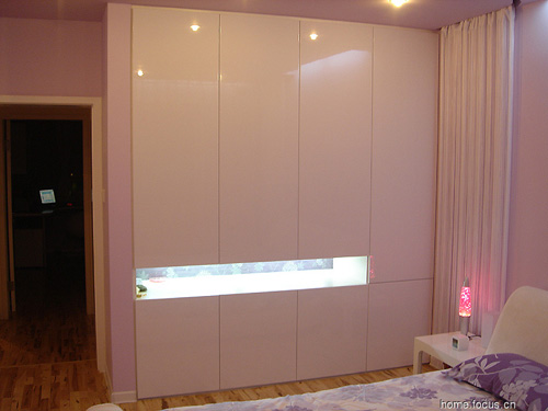 自己设计的衣柜,中间的镂空处贴的纹样壁纸和电视墙呼应