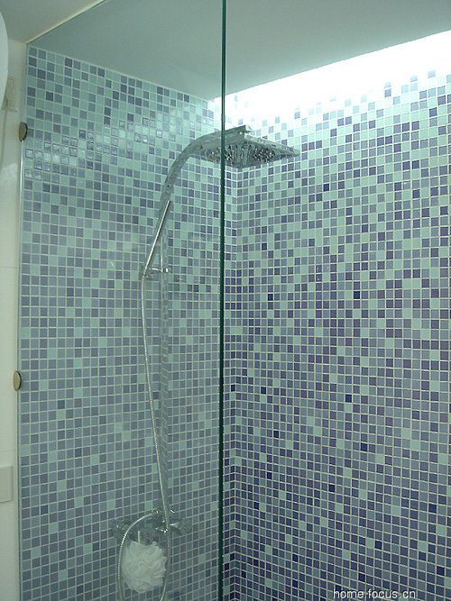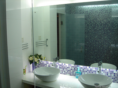 透过卫生间的玻璃隔断看到的镜子和手盆