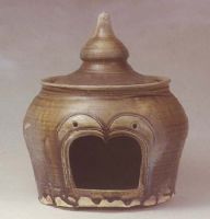 说 明: 胎体较厚,白色.器内外施青釉,底无釉,釉厚处呈褐色或蓝色.唐代佛教盛行,随之出现瓷质佛教用品.瓷龛造型奇特,制作精致,属北方瓷中的特殊产品.