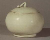 说 明: 胎白质坚,内外施白釉,盖内无釉.此罐制作工整,胎薄体轻,釉色莹润,莲瓣刻划丰满规矩,具有五代定窑白瓷特征.
