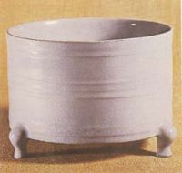 说 明: 器里外满釉,有细碎开片.在以制作精细规整见长的汝窑器中,仿汉代三足奁属少见.