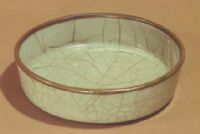 说 明: 青釉.内底印凸花龙纹,因釉汁肥厚,纹饰不清晰,洗口釉薄并镶有铜口.此盘在传世官窑中极为珍贵.