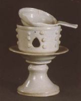 说 明: 胎较厚,质坚细,色洁白.釉色白,较厚,积釉处闪青.胎釉有裂纹.此炉造型新颖,仿温器作,但非实用品.