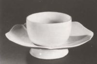 说 明: 胎薄,质细白,釉面晶莹匀净,微泛黄,芒口毛足.采用釉接法,底书一行书"官"字.造型秀丽.