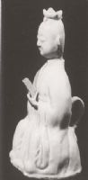 说 明: 胎质坚密,呈灰白色,釉色白中微泛黄.壶的造型优美,构思巧妙,比例协调.衣纹线条流畅有力,是罕见的艺术珍品.