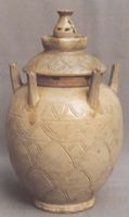 说 明: 胎色微黄,青黄色釉开细冰裂纹.花纹装饰简洁朴素,造型稳重,是越窑晚期不可多得的制品.