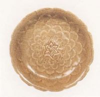 说 明: 胎灰白细洁,釉色青中泛黄,有细冰裂纹,足底无釉,矮圈足.盘内刻有"做出芙蓉样青器,卖买客人皆富贵"七言诗二句,反映了窑主人的愿望.