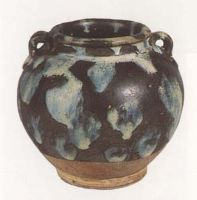 说 明: 胎色灰白.黑釉花瓷是唐代创造的一种独特装饰风格,为后来的宋代钧窑彩斑开启了先声.