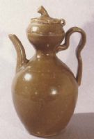说 明: 五代.胎灰白,施酱釉,开细纹片,釉色柔和雅洁.造型优美适用,设计颇具匠心.
