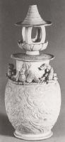 说 明: 俗称魂瓶.胎质细腻.施青白釉.造型新颖别致,纹样生动优美.
