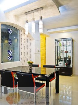 这是套两室一厅的房子没有餐厅的位子,但经过设计师的巧妙设计餐厅也有了它自己的位子。餐厅以吊顶来与客厅进行区域划分,从空间看既是客厅的一部分又是个独立的空间,这真是个用心的设计。餐厅的背景墙采用部分彩绘的透明玻璃做背景,在背景墙的整体设计上以拉伸型的壁纸来拉伸视觉空间,半弧型的造型上还安装了两个射灯来打出彩绘玻璃的色彩感。这个透明的彩绘玻璃既产生了视觉美又体现了功能互补上,在厨房可以看见客厅里的一切,在客厅也能看到厨房,在灯光上也起到互补,既美观又实在。
