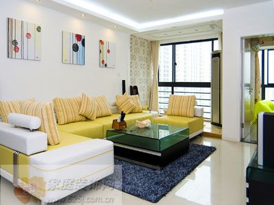 客厅使人眼前一亮,在客厅里没有多余的装饰,白色的墙壁显得客厅既清爽又简洁。看见墙壁上挂的三幅画了吗?据说那个是一大幅画拆成九幅小画这是其中的三幅,真的是既有创意又体现了现代印象风。客厅没有用铺实木地板而采用了米色玻化砖,玻化砖显得客厅更明亮更宽敞而且日常打扫也方便,这也是很多小客厅现代风格的另一个标志。客厅里的沙发很抢眼,黄白搭配在一起感觉特别的养眼与温馨。深蓝色的地毯体现了客厅的稳重感与深色的茶几色系上相呼应,使客厅显得更具有色彩层次感。