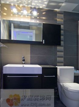 浴室采用冷色调为主,墙顶的铝扣板与厨房采用一样的材质与色系这使空间风格更显得统一性。墙壁采用的青石砖类似的来装饰,米色与灰色搭配在一起,现代气息十足(这个砖据说材质很硬的,施工起来很不方便,但施工后效果也是可见的)。黑色的柜子与客厅里的家具色是一样的,黑色的储蓄柜显得很大气,稍加观察就可发现柜子的另一个秘密哦,拉开镜子里面是个很大的储存空间,以后可以把瓶瓶罐罐都收纳在里面很实用,这也是设计师的用心之处。值得一提的是浴室里的三盏节能灯很亮很玄,结合现代风为一体的完美效果。