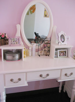 八十年后的女孩的卧室里一定少不了梳妆台,这款梳妆台非常淑女再适合不过了。梳妆台一定要有储存空间,八十后的女孩总是会有很多小秘密的。在梳妆台上还可以摆放些自己喜欢的饰品,一个首饰架就把平时零零碎碎的耳环项链都收拾干净了,而且需要时一目了然,这个是非常实用的韩式收纳法哦。