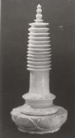 说 明: 舍利罐.胎质灰白较细腻.基座及塔身釉色灰白光亮,积釉处有冰裂纹.塔顶胎质较松,泛黄,釉薄.此件具有辽代密檐式塔的风格.