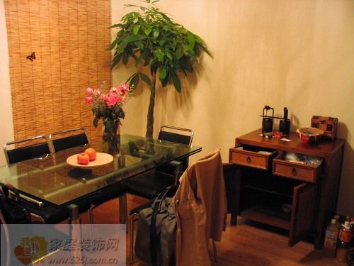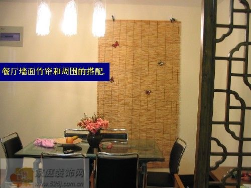 在餐厅的布置之中,当作玄关的屏风,墙上的竹帘,简洁古色古香的家具,都是强烈的中国符号,镂空花色的屏风,有老北京的风味,挂着的竹帘,让人想起长江边风雨中的乡土民居,仿古台子,更是展现了中国古老工艺。