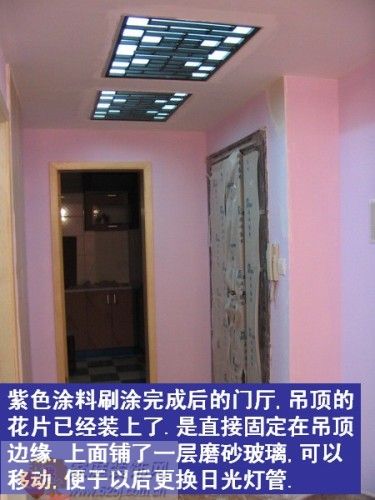 门厅吊顶不是例常单一的灯具,而是镶嵌在吊顶里面的中式花片式的吊灯,而磨砂的玻璃,更让这款吊灯显得有古代窗棂的感觉,而本身的造型,就有点像古房中的天窗,只是这个天窗非常具有中式的风格。