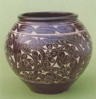 说 明: 在剔出的米黄色的胎地上烘托黑褐色釉的花纹,色调和谐,纹饰粗放,是雁北地区剔花装饰的代表作品.