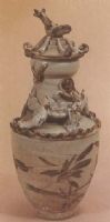 说 明: 胎灰色,釉青白.腹部并有赭黑色彩绘,釉色匀净,整个造型显得玲珑而精美.