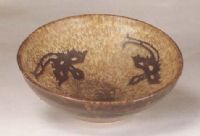 说 明: 通体施黄褐色斑纹釉,底足无釉.碗内壁用剪纸凤纹图案喷印出三只飞凤.碗中心印一花朵纹,极富民间装饰艺术趣味.