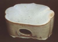 说 明: 如意头形,枕面及四侧均施天青色釉,釉层肥厚而混浊,底部涩胎上涂有酱色釉.宋代流行瓷枕,钧窑却少见.