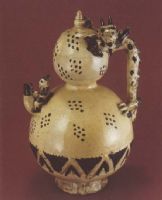 说 明: 淡黄色胎.挂牙白釉,釉层较厚,足根露胎.此注壶顶无口,而在圈足内挖一圆注水孔,与通入壶内的注水管相连,装水时将壶倒置.可谓构思奇特,独具匠心.
