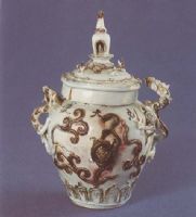 说 明: 胎质细腻,青白釉.堆塑饰以釉里红点缀,造型生动,形象逼真.全器造型奇特,工艺精巧.