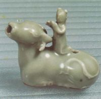 说 明: 文房用具.周身施粉青釉,平底露朱红色胎.牛脊背部开注水口,嘴为流口.静中寓动,富于生气.