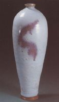 说 明: 胎质细腻,色灰白.器表施釉呈月白色,釉层较厚,表面有棕眼,器身饰紫红斑五块.造型优美,釉色柔和,彩斑多而艳丽,为钧窑佳品.