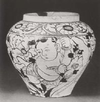 说 明: 白釉黑彩.花朵和婴儿两相衬映,生动活泼.