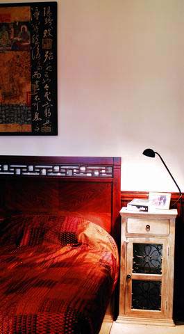 厢房也是简约风格,有百年历史的中式木质大床搭配没有任何图案的床单和窗帘,气质坦白飘逸;用来分隔空间的帷幔用的是正红色,红色拥有很好的归依感和私密性,但面积过大有些单调,刚好,手工缝制的有亮片和刺绣的东南亚风格靠垫玲珑精致,中和了这份单调。