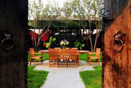 玻璃长廊在第三进院里搭出了一间玻璃浴室,算是到了头。这第三进院是客房,大约50多平方米,面积较前两个院要小很多。不同于二进院的西洋格调,这里完全是旧式文人与世无争的气度,墙头一抹纤竹斜立,门口两把懒洋洋的藤椅,角落里堆些粗土瓦罐。闲来无事,在这里观花弄猫,怡情养性最合适不