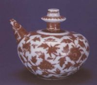 说 明: 军持系佛教僧侣用以饮水或净手的器皿.器身饰满缠枝牡丹纹,釉色艳丽,是釉里红品种的特有造型.