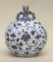 说 明: 胎薄体轻,青白色,釉面光润.整个纹饰色泽浓淡适合,浓艳处聚有原铁锈斑点.是永乐时期青花瓷中的佳品.原系热河行宫陈设之物.