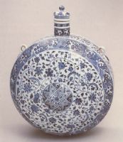 说 明: 此壶又称卧壶,造型奇特,系受当时西亚文化影响的结果,青花呈色浓艳青翠,用进口青料绘制而成.