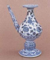说 明: 用苏麻离青料绘缠枝莲纹,纹饰纤细有力,色彩艳丽,此器受西亚文化影响,造型雅静.梵语谓之"净瓶"、“军持”.原为宫廷旧藏.