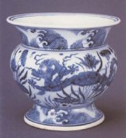 说 明: 通体纹饰三层,是宣德青花瓷中使用较多的纹饰.青花浓艳,深沉处有黑色点状结晶斑,具有宣德青花的典型风格.